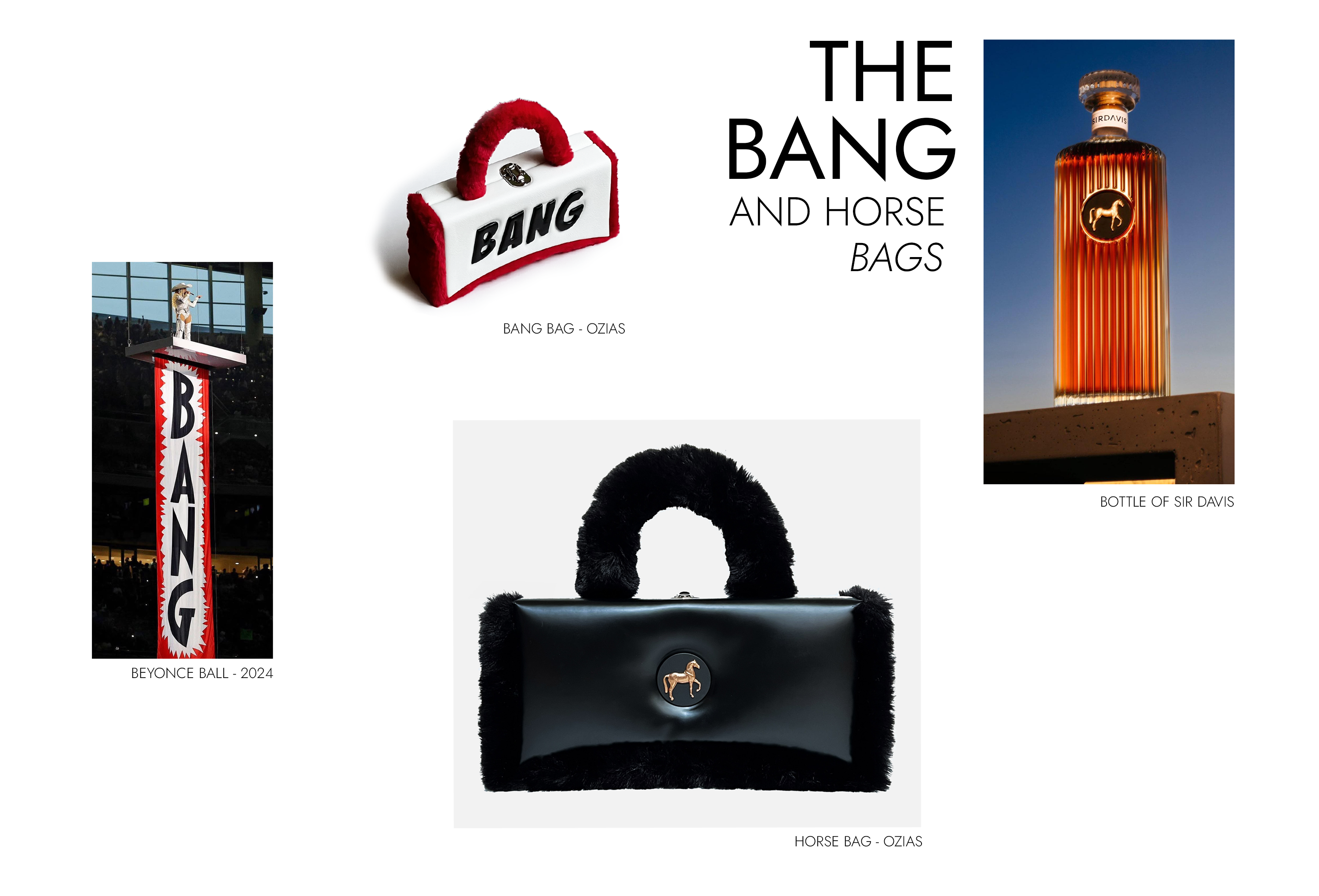 After Jolene, Ozias created two more bespoke pieces for Beyoncé. The Bang Bag, made from white leather and bright red faux fur, was inspired by the Bang Flag seen at the Beyoncé Bowl, adding a playful, cartoonish touch to the design. Next came the Horse Bag, crafted from sleek black leather with a bronze horse taken from a Sir Davis Whisky bottle, accented with black faux fur for a unique, striking finish.