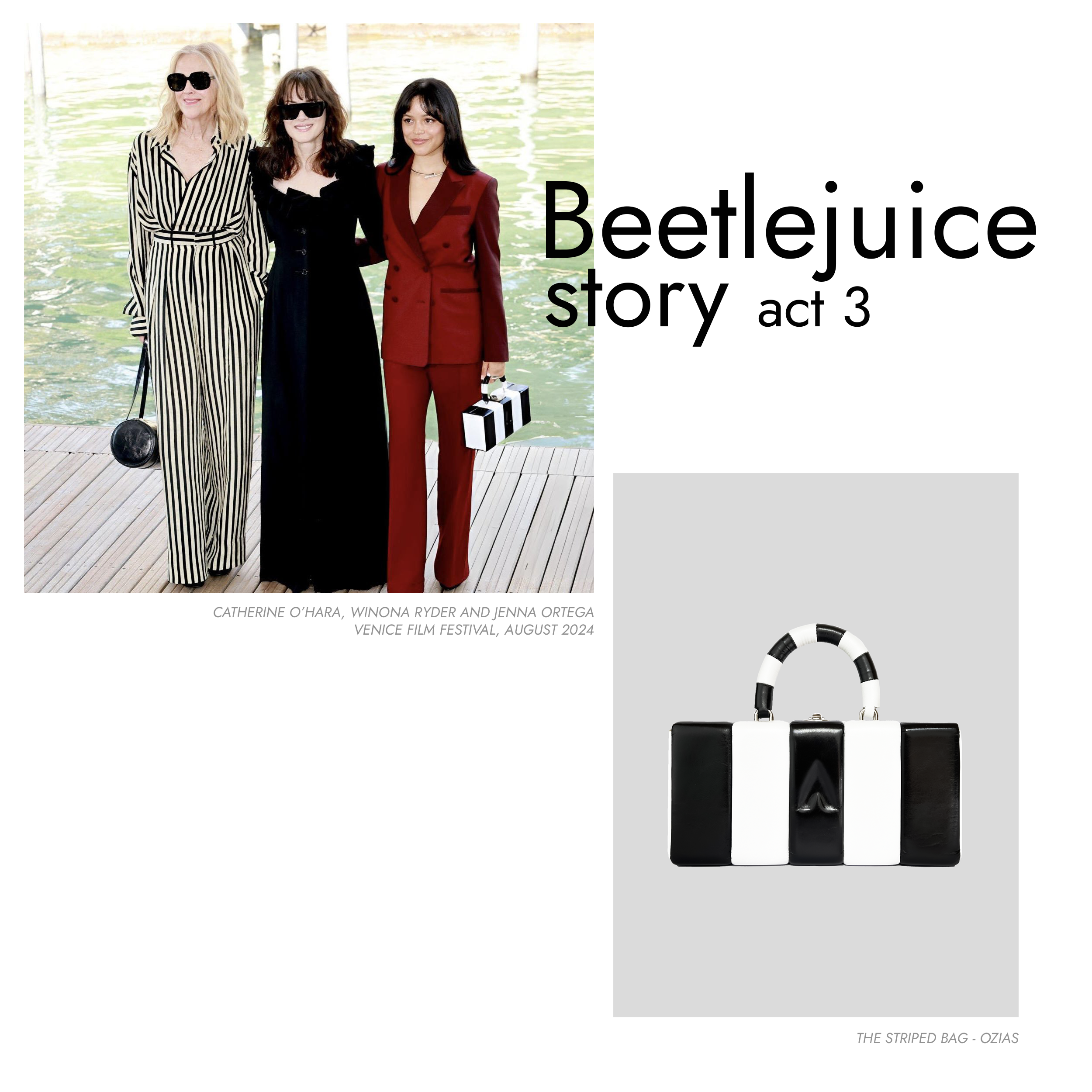 Ozias designed the Black and White Trunk Bag for Jenna Ortega, which she wore at the Venice Film Festival alongside Catherine O'Hara and Winona Ryder for the Beetlejuice premiere in Italy. Crafted from wood and leather, it embodies Ozias’ ultimate signature. The design is directly inspired by Beetlejuice's iconic costume, merging fashion and craftsmanship in a bold new way.